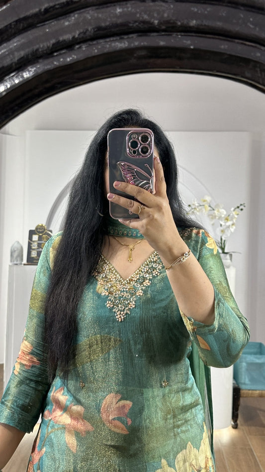 Green Tissue Kurti With Floral Dupatta