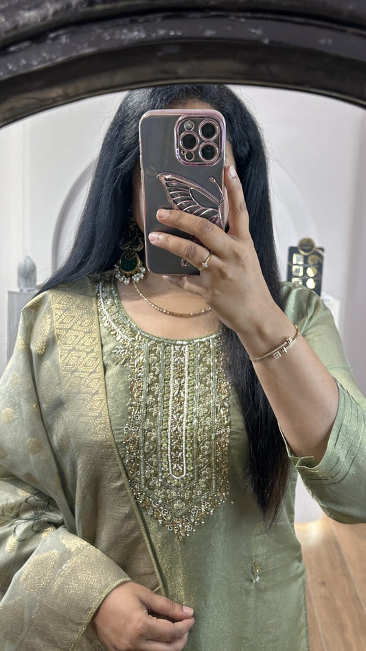 Green tissue V neck kurti with maggam work