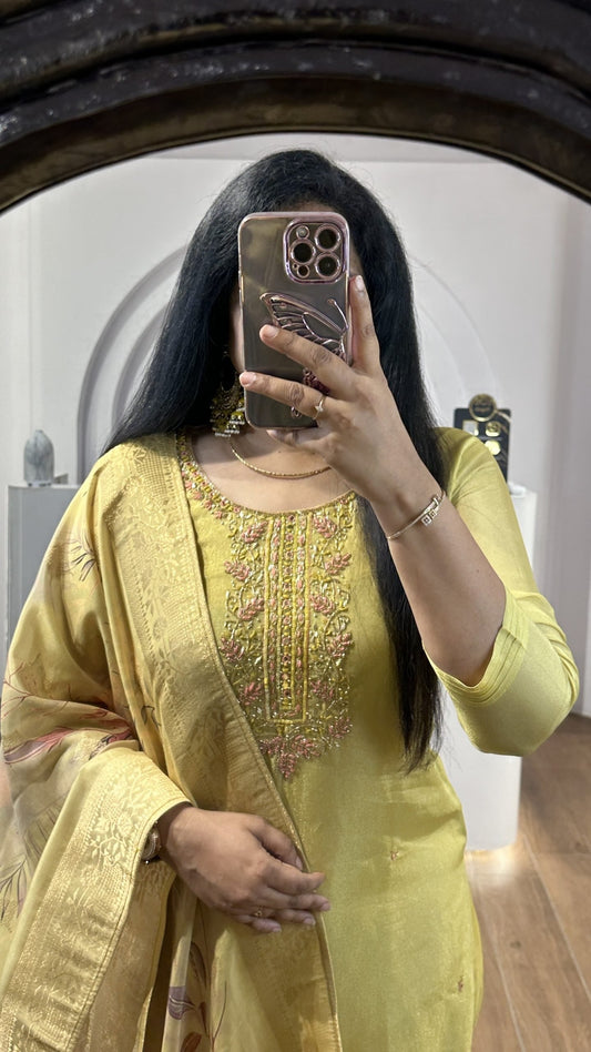 Yellow Tissue Floral Handworked Kurti