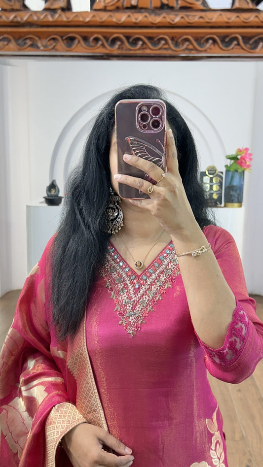 Pink Tissue Big Floral Handworked Kurti