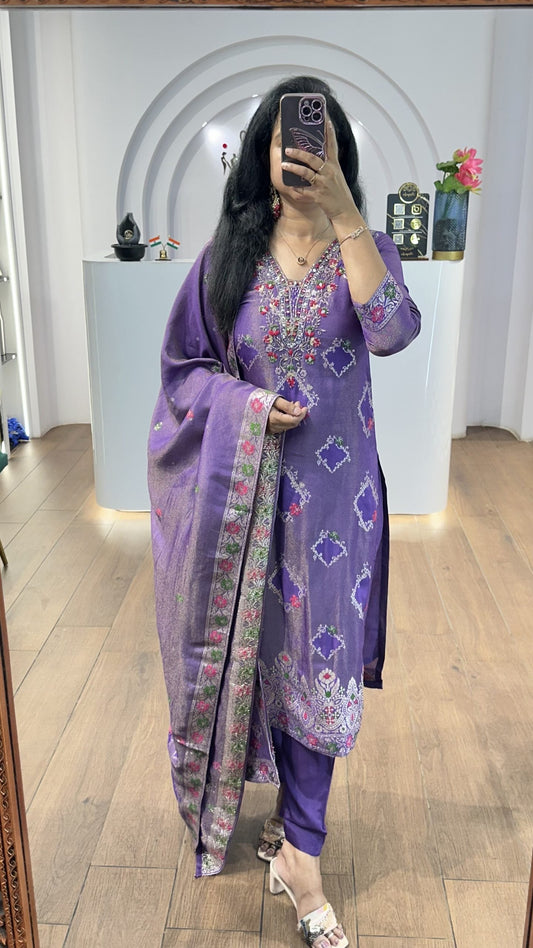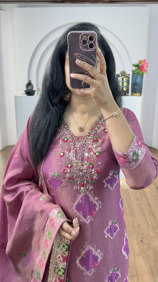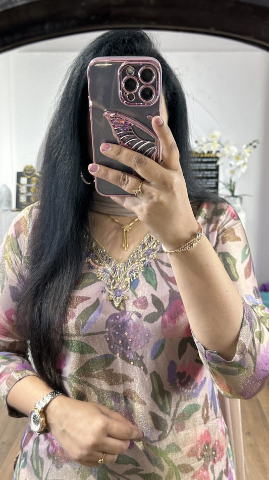 Violet Tissue Floral Handworked Kurti